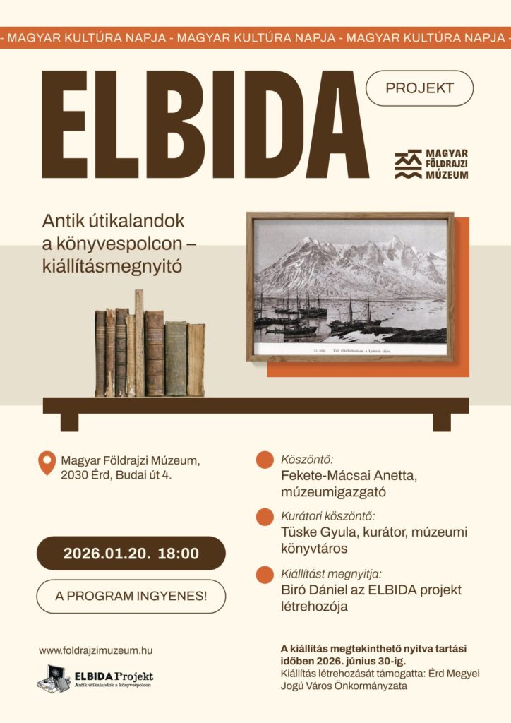 A Magyar Kultúra Napja alkalmából különleges kiállításmegnyitóra várja az érdeklődőket a Magyar Földrajzi Múzeum. Az ELBIDA projekt – Antik útikalandok a könyvespolcon című kiállítás méltó módon kapcsolódik a Magyar Kultúra Napjához, hiszen a könyvek, az utazás és a tudás iránti kíváncsiság évszázadokon átívelő értékeit állítja a középpontba. A tárlat megnyitóját január 20-án, kedden 18:00 órakor tartják Érden, a Budai út 4. szám alatt.