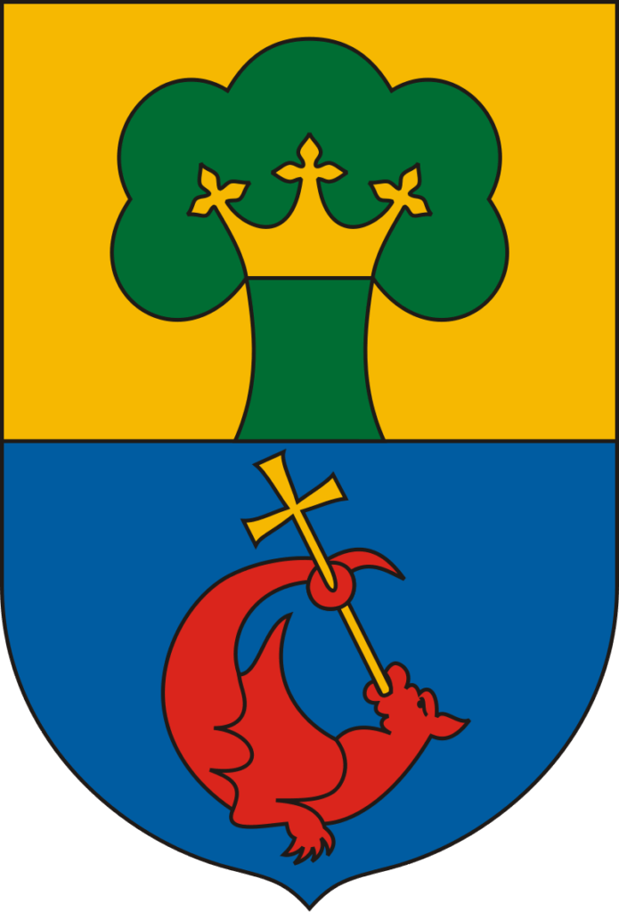 A város címere fekete kávás, csücskös talpú pajzs, felül arany mezőben koronás fa jelenik meg, alul zöld mezőben stilizált táj motívumok utalnak a település földrajzára. A koronás fa a helyi történeti folytonosság jelképe, a színek és formák pedig a földrajzi környezetre rezonálnak.
