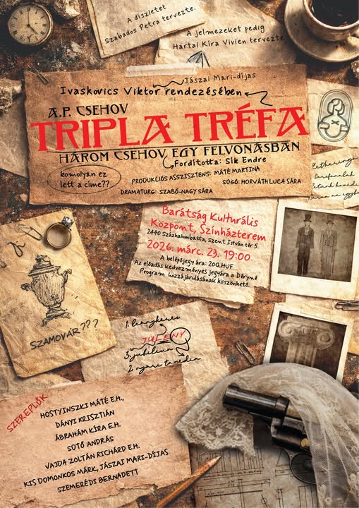 Különleges színházi est várja a közönséget március 23-án, hétfőn 19:00 órától a Barátság Kulturális Központ színháztermében, ahol a Déryné Társulat előadásában a Tripla tréfa című drámai komédia kerül színre.