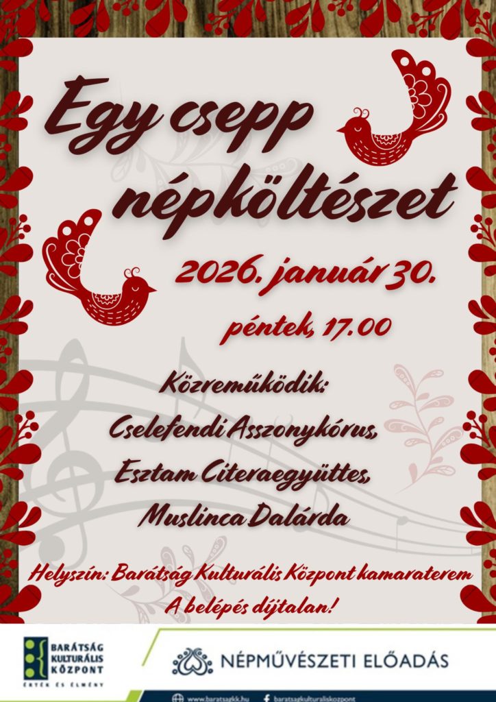 Különleges népművészeti esttel várják az érdeklődőket Százhalombattán január 30-án, pénteken 17:00 órától a Barátság Kulturális Központban. Az „Egy csepp népköltészet” című program a hagyomány, a dallam és a költészet világába invitálja a közönséget, ahol a magyar népdalok időtálló szépsége kerül a középpontba.