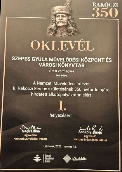 Kiemelkedő szakmai sikerrel gazdagodott Érd kulturális élete: a Szepes Gyula Művelődési Központ és Városi Könyvtár első helyezést ért el a Nemzeti Művelődési Intézet által meghirdetett alkotópályázaton, amelyet II. Rákóczi Ferenc születésének 350. évfordulója alkalmából írtak ki.
